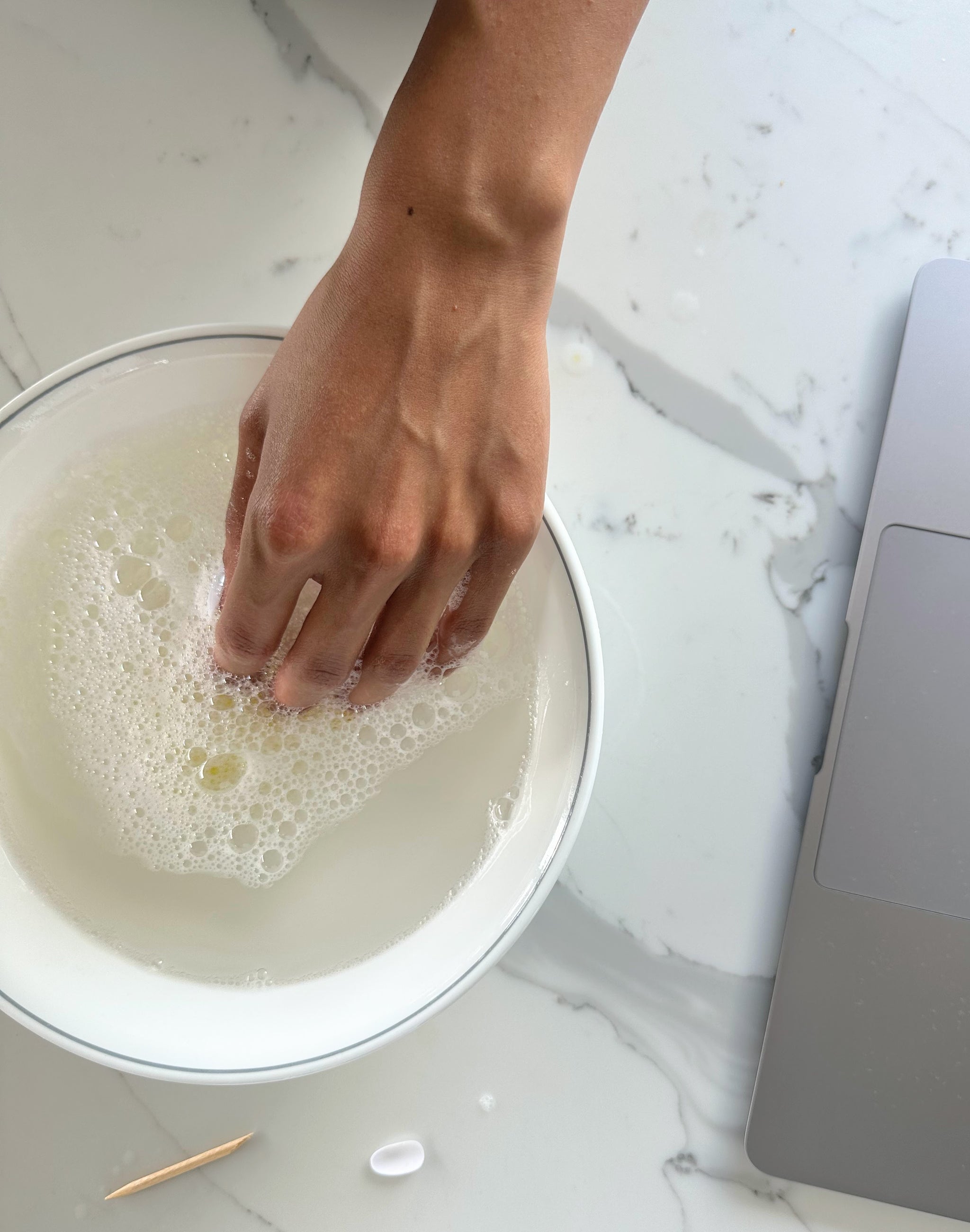 To prep your Birdie nails for reuse, soak the worn press-ons in a bowl of warm soapy water for 5-10 minutes. This will help break down any leftover glue. Remove the press-ons from the water and dry.