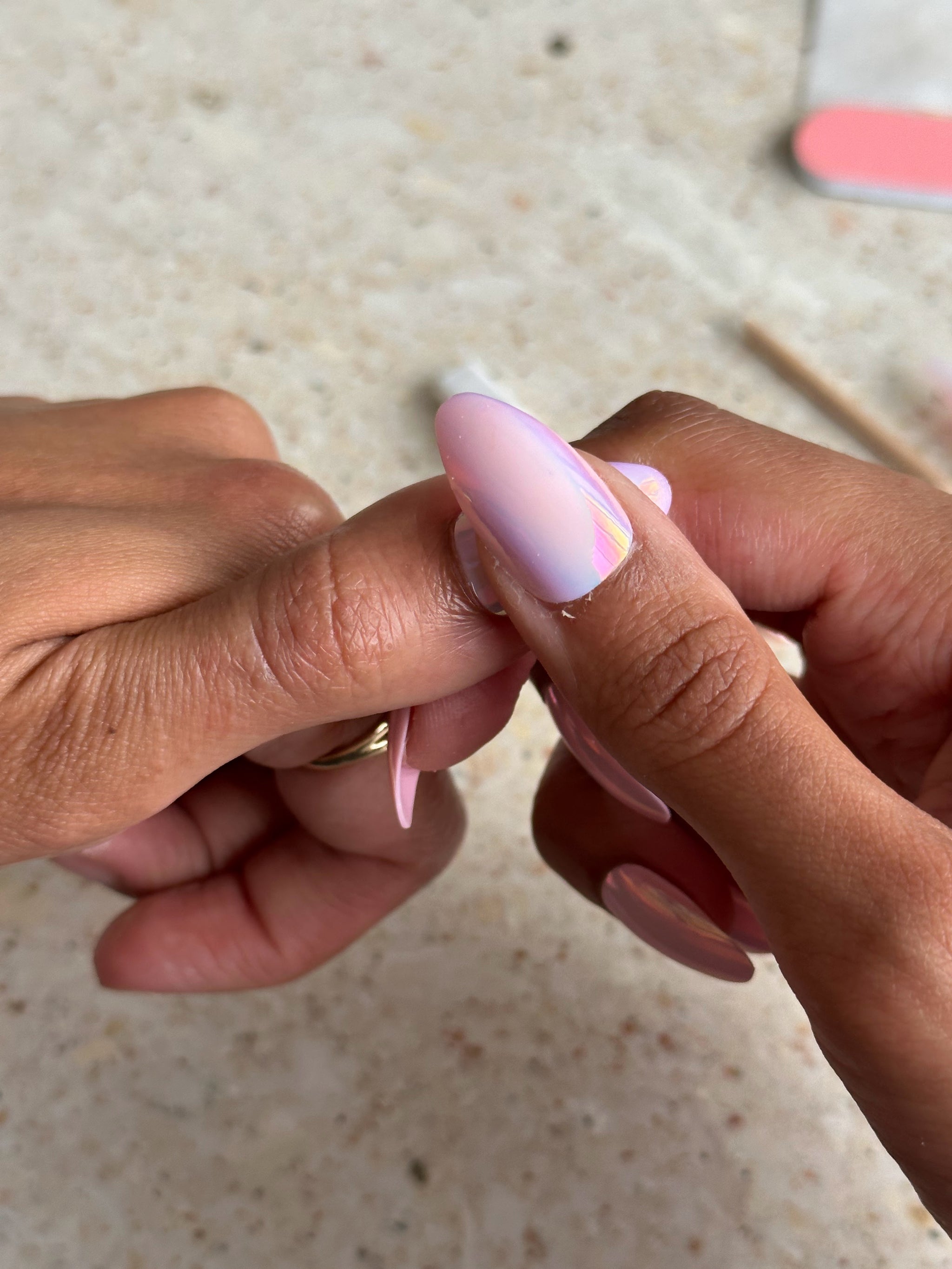 - Once you begin to feel the glue soften, use the cuticle stick provided to gently unstick the edges and tip of your Birdie nail. Your Birdie nail should easily pop off from here.
